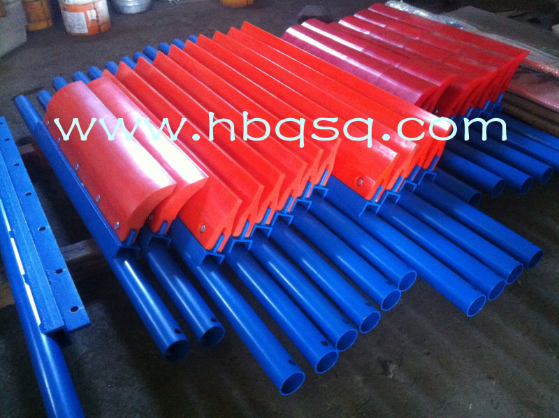 聚氨酯清扫器主要作用是清扫运输皮带表面的附着物,在输送机上有着不可忽视的作用,靠皮带传动的生产线基本都需要靠它来对皮带或输送带进行清扫。 清扫器我国的发展和起步都比较晚,被引进国内之后随着市场和工厂设备的需求得到了相应的开发,现随着近几年产业和清扫器的研发力度加大,一些企业产品的质量和技术水平已经达到或接近国际水平 。 带式输送机输送物料时若输送带上残留或附着物料或者其他物质如果没有清扫器的协助这些东西就很容易的能进入到输送机滚筒或托辊轴承座内部使轴承磨损严重、滚筒或托辊表面这样会缩短皮带的使用寿命造成皮带表面磨损和断裂。如果给运输设备配上清扫装置则能很有效的保护皮带以及运输设备其他的部件能提高设备的有效使用时间。所以清扫器的清扫能力对提高带式输送机的运行效率和使用寿命以及减少设备故障率和降低维护成本有着至关重要的作用,胶带输送机必备配件。